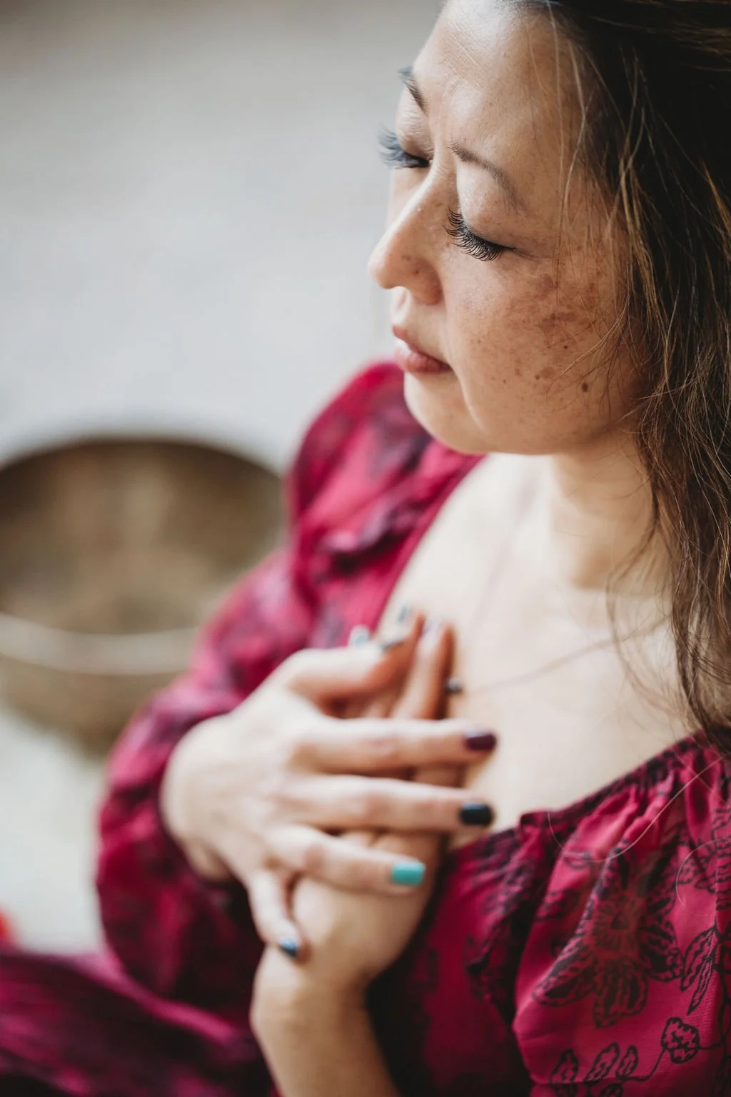 Close your eyes, take a deep breath in through your nose, and slowly exhale out through your mouth. Do this as slowly and deeply as you can, equal parts in and equal parts out. Do this breath two more times.